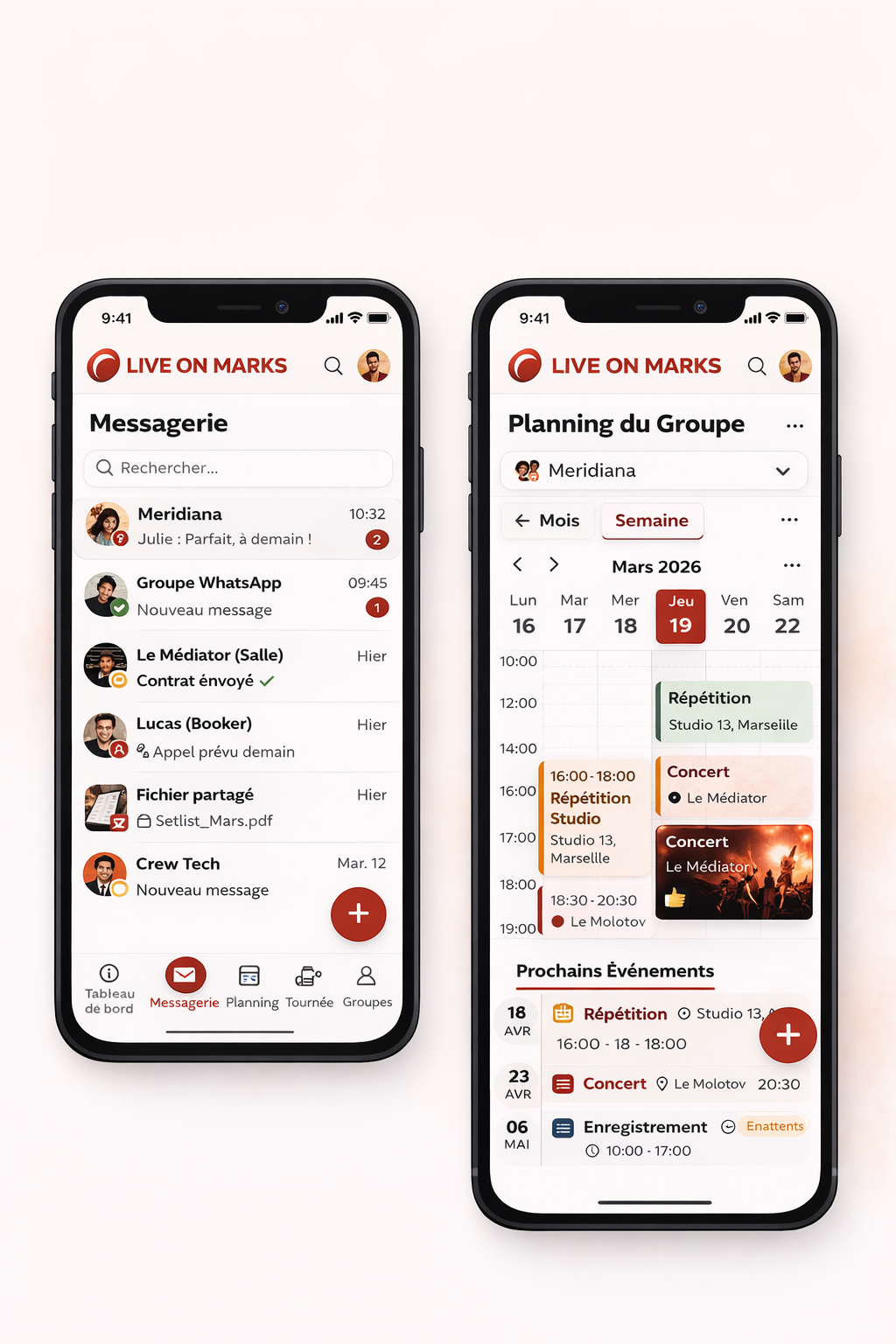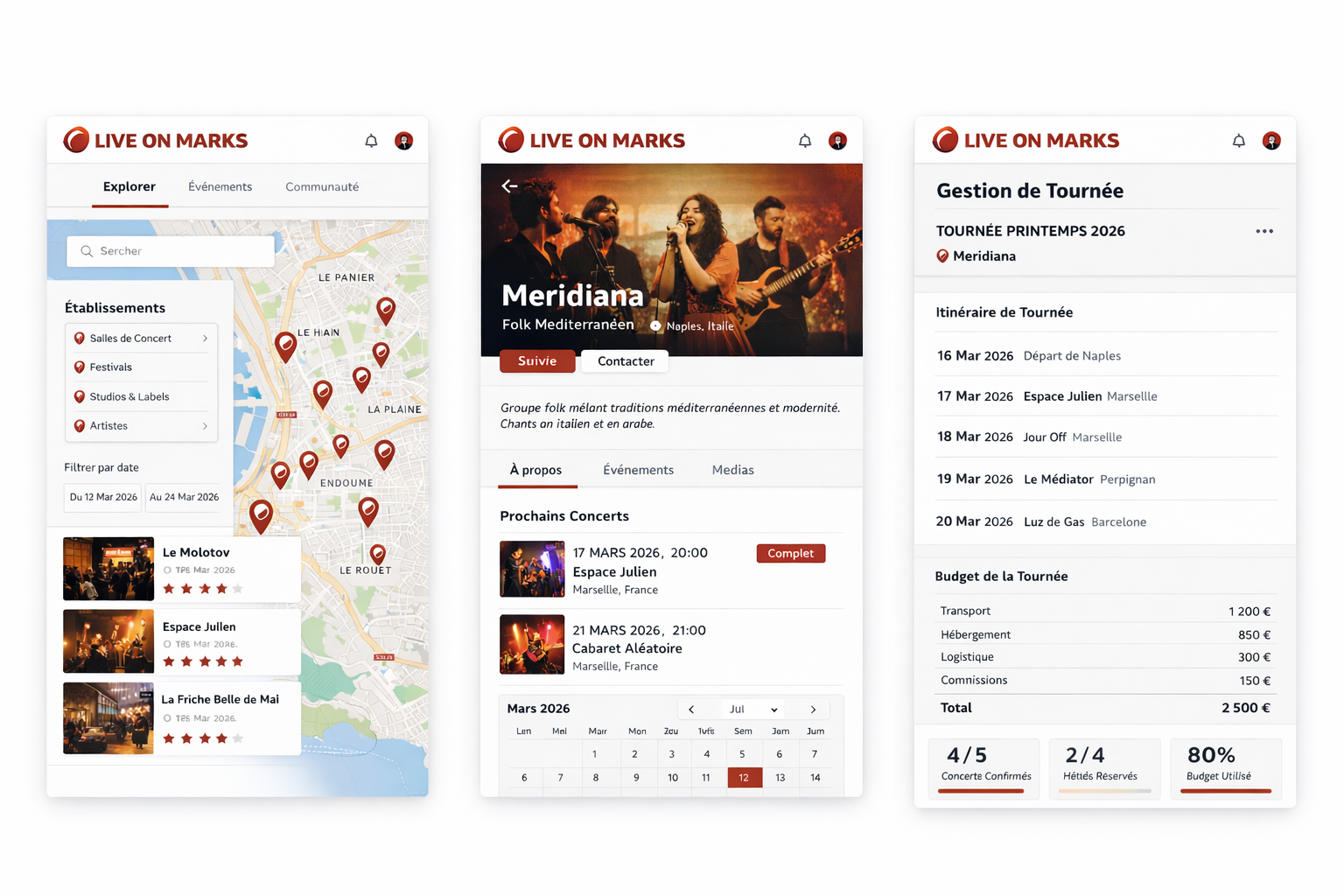 Live On marks provides the public with a readable and participatory application allowing them to find out about the musical programming around them in their choice criteria